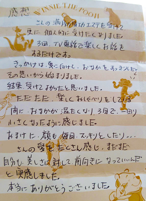 受け続けるうちに「あれ?なんだかズボンがゆるくなってる!!」。ウエストが細くなったり、肌がひきしまっていたり…。1番気にしていた足も細くなってきて、どんどんと鏡をみるのがたのしくなりました。